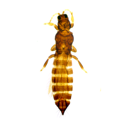 Color: Â Most thrips range in color from translucent white or yellowish to dark brown or blackish, depending on the species and life stage. A few species are more brightly colored, such as the distinctive reddish orange abdomen