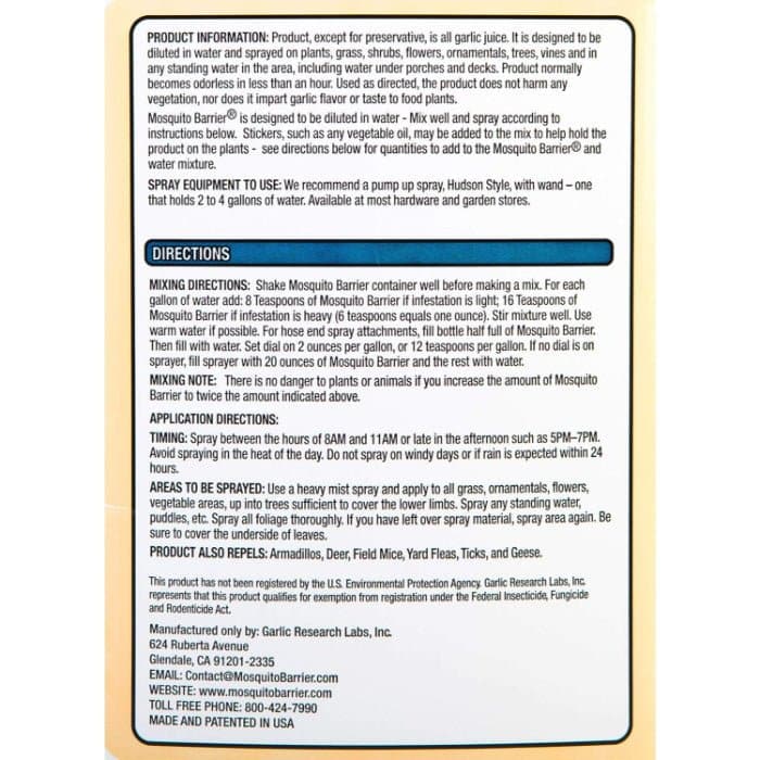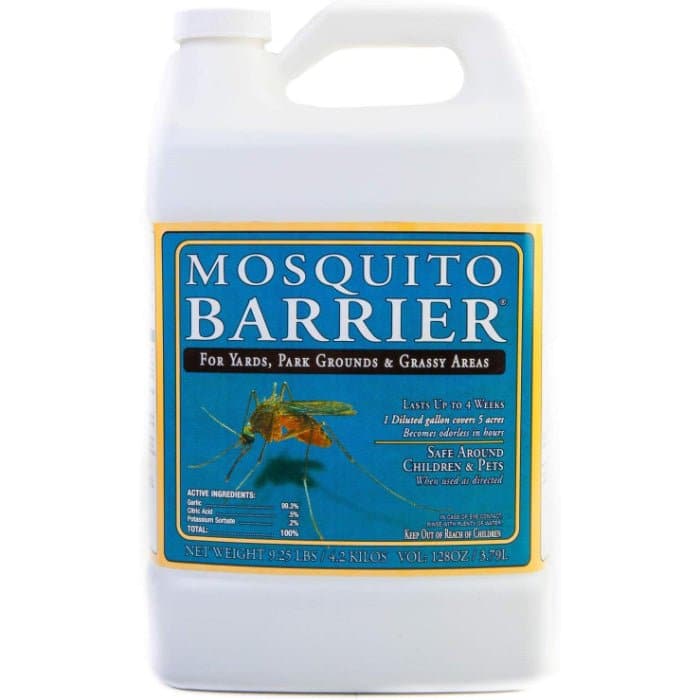 Description Mosquito Barrier is natural, a very strong liquid garlic based formulla that will keep pests like gnats, mosquitoes, ticks, fleas and ants out of your yard, golf courses, parks and fields. It kills the adult mosquitoes, The garlic coated plants keep mosquitoes out of the area, It suffocates any mosquito larvae in standing water, such as puddles, under decks, water in tin cans or depressions in lawn, etc., Mosquito Barrier is a natural formula that is safe for pets and children.