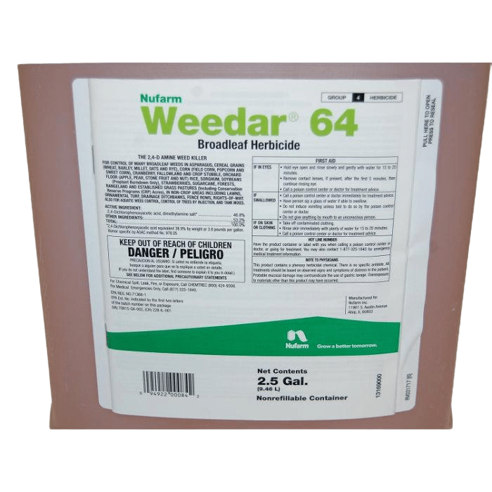 | Description | Nufarm Weedar 64 is a selective herbicide which provides broad-spectrum control of annual, biennial, perennial broad-leaf weeds. |